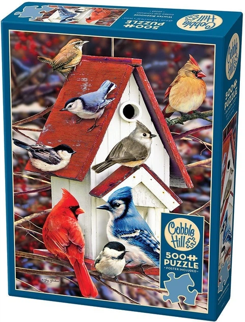 Цей червоно-білий зимовий шпаківень чудово прикрашений та відвідується всілякими птахами. Тут є кардинали, сині птахи, повзики та інші! Деяким ентузіастам головоломок це може здатися складним завдяки розмитому фону червоного, білого, синього та коричневого кольорів, зробленому з паличок, ягід та снігу.