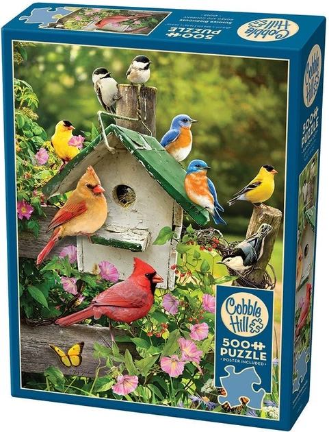 Літня шпаківня сьогодні повна пернатих друзів! Цей сонячний пазл із 500 елементів містить кардиналів, синіх птахів, повзиків, жовтих зябликів та метеликів, а також прекрасну зелень та рожеві й блакитні квіти.