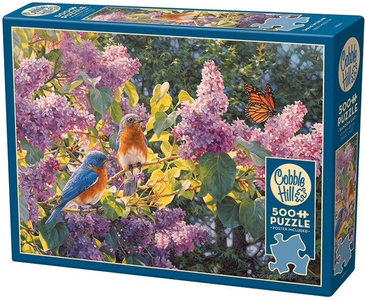 Весняні канікули між синіми птахами та метеликами — чудові квіти бузку освітлюють день. Складна головоломка з темно-зеленим фоном та великою кількістю бузку, але яка ж вона гарна, коли її зіграти!