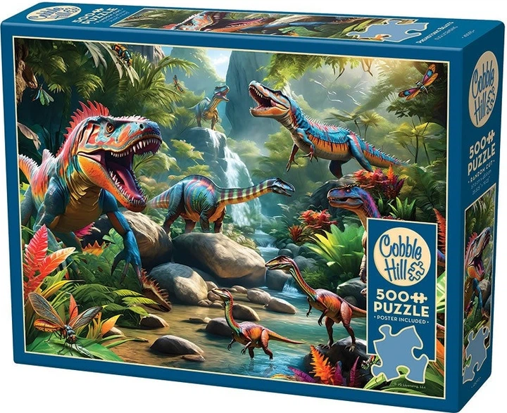 Чи відчуваєте ви шалений рев динозаврів? У фільмі "500 шматочків" ви можете відчути радше тремтіння, ніж спокій, коли ці динозаври домінують у джунглях. Барвистий тиранозавр, загрозливо роззявивши щелепи, демонструє свої вражаючі зуби. Від лісової підстилки до стрімких скель водоспаду присутність цих доісторичних істот резонує з непідробною силою.