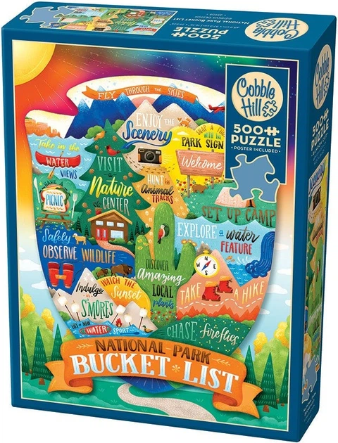 Цей барвистий колаж від Zirkus Designs містить кілька міні-сценок на свіжому повітрі та висловів у формі значка. Фон чудово зображений, від сходу сонця до зоряної ночі та від лісу до струмка. Цей веселий пазл із 500 елементів уособлює красу природи національних парків.