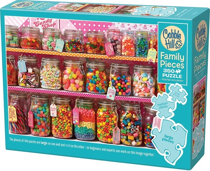 Прилавок із цукерками сповнений смачних та барвистих солодощів! Завдяки трьом різним розмірам деталей, від великих до середніх та маленьких, гравці будь-якого розміру рук та рівня майстерності зможуть працювати разом, щоб зіграти цей веселий сімейний пазл із 350 картинками.