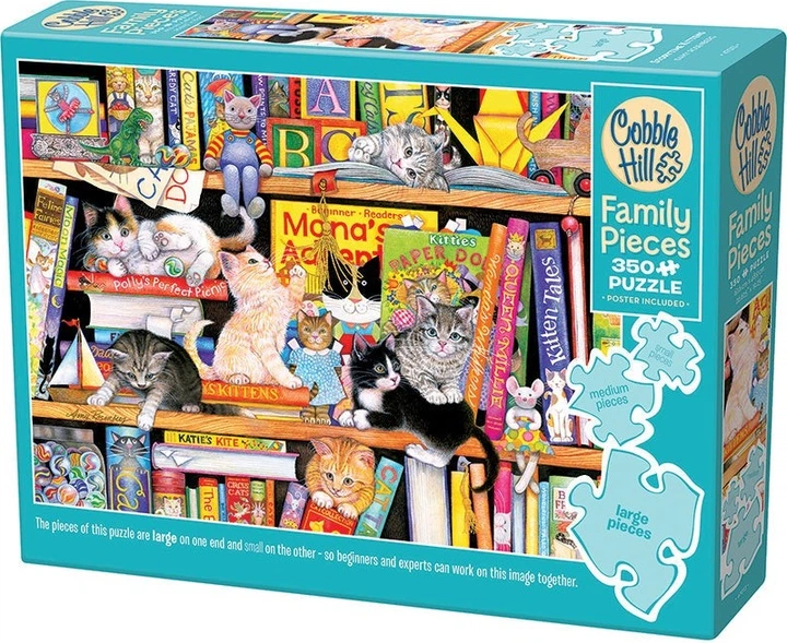 Кошенята з мультфільму «Казки на ніч» граються серед книжкових полиць, насолоджуючись іграшками та історіями про котів. Цей сімейний пазл із 350 частин складається з великих, середніх та малих елементів, що розташовані каскадом зверху вниз, що дозволяє гравцям будь-якого рівня майстерності долучитися до розваги.