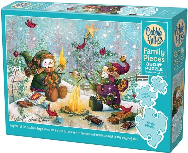 Ще «Смачніші розваги» зі сніговиками у зимовій країні чудес, які гріються біля вогню та смажать зефір. Здоровий для всієї родини пазл «Сімейні деталі» з 350 деталями різних розмірів — від маленьких до середніх та великих — щоб кожен міг зробити свій внесок у розвагу!