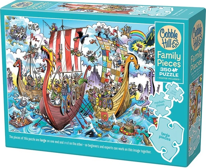 Настав час для Дудлі вирушити у власну подорож вікінгів! З істотами, що плавають на імпровізованих плотах, та дурними вікінгами, що гойдаються на вітрилах, ширяють у своїх надувних кільцях та взагалі бешкетують, але хіба не це робить їх такими веселими! Багато веселощів у цьому мультяшному пазлі "Сімейні елементи" з 350 елементів, повному хаосу, але не дозволяйте богам вас почути, бо вас може вдарити блискавка!