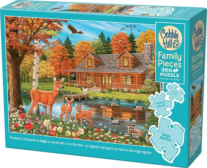 Осінь, любі мої, і ніщо не демонструє її красу краще, ніж день біля ставка «Маленький будиночок»! Цей пазл «Сімейні елементи 350» стане чудовою розвагою для всієї родини, адже ви знайдете тут усе: від єнотів до качок, що плавають, гусей, орла над головою та навіть маленького песика, який виходить зі своєї дерев'яної хатини, щоб привітатися зі своїми друзями-оленями.