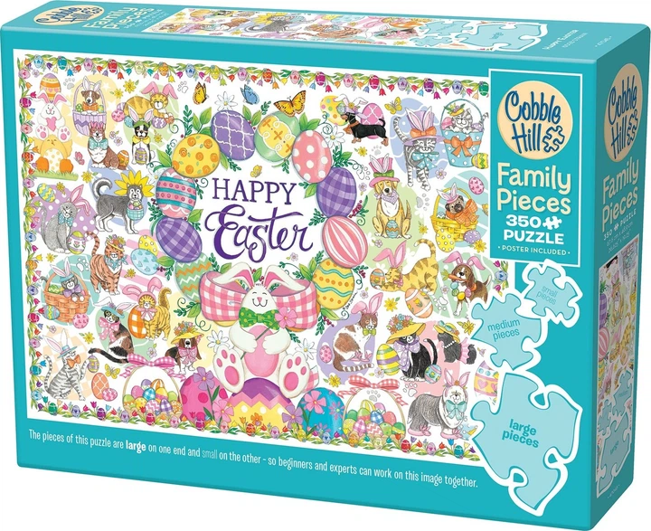«Щасливого Великодня» – це справжній вибух весняної радості! Цей веселий набір пазлів «Сімейні шматочки 350» одягає собак та котів у святковий одяг. Тут стільки всього цікавого, що це майже як пошук пасхальних яєць у коробці з пазлами! Для ще більшої розваги ви можете заховати деякі шматочки пазла в пластикові пасхальні яйця та розховати їх по всьому будинку. Тільки не забудьте намітити ці приховані шматочки пазла, бо ми не хочемо, щоб якісь шматочки пазла втекли!