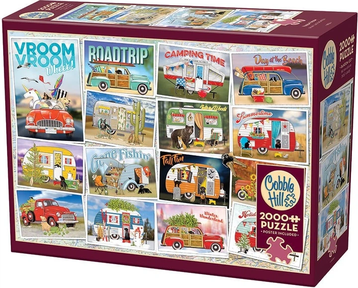 Врум-Врум! Час для більшої подорожі! П'ятнадцять видів листівок у цьому колажі-пазлі уособлюють радість подорожей автомобілем у всі пори року! Якщо 2000 деталей для вас забагато, зверніть увагу на версію з 1000 деталей під назвою «У дорозі».