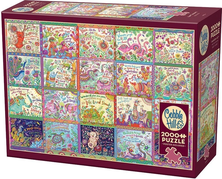 «Щасливі думки» сповнені барв! Зустріньтеся ближче та відкрийте для себе всі надихаючі цитати, які нагадують нам сповільнитися та дозволити життю здивувати нас. Який чудовий спосіб провести час із цим пазлом із 2000 елементів, у якому представлені химерні малюнки Дебі Грон. Ілюстрацій дикої природи безліч, зокрема чарівна коала, грайливий лінивець, веселі слони, пернаті фламінго, милі лами та багато іншого. Справжнє свято пошуку свого шляху та руху за течією!