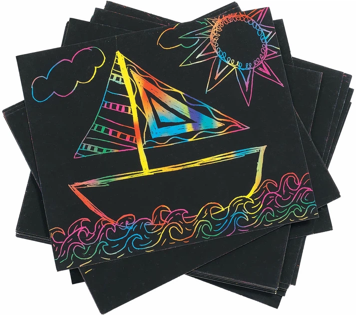 Ці різнокольорові скретч-карти з чорним покриттям мають легко дряпану поверхню. Розмір кожного аркуша 15 x 15 см. Юні художники можуть експериментувати, пишучи, малюючи, створюючи ілюстрації та дизайни на цьому простому у використанні скретч-папері. Кожна упаковка містить 100 карток. Не містить латексу.