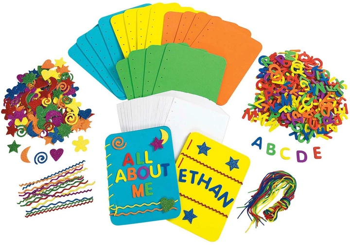 Набір для створення щоденника з пінопласту своїми руками. Набір містить 12 щоденників, пінопластові картки різних кольорів, пінопластові літери, прикраси, мотузку та папір. Виготовлено з пінопласту, паперу та пластику.