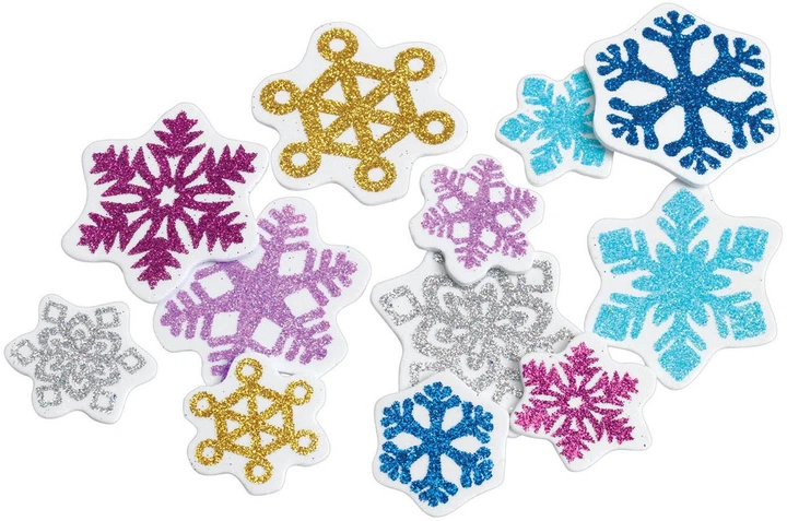 Додайте блиску будь-якому виробу! Ці блискучі сніжинки доступні в шести яскравих кольорах та двох розмірах: 5 см та 3.2 см. Дітям сподобається комбінувати та поєднувати ці легко склеювані шматочки пінопласту, створюючи унікальні, блискучі витвори мистецтва.