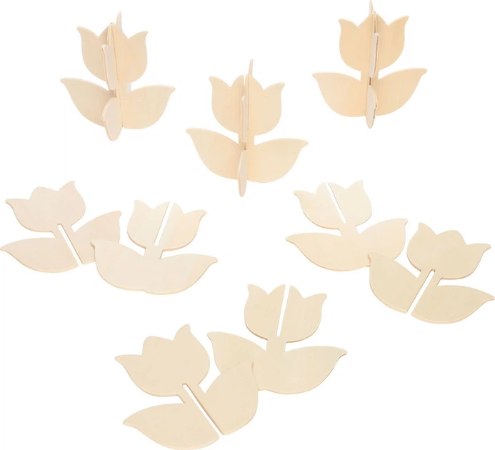 Вміст: 12 простих у складанні 3D-дерев'яних тюльпанів розміром приблизно 10 см x 10 см. Кожен тюльпан складається з двох однакових частин.