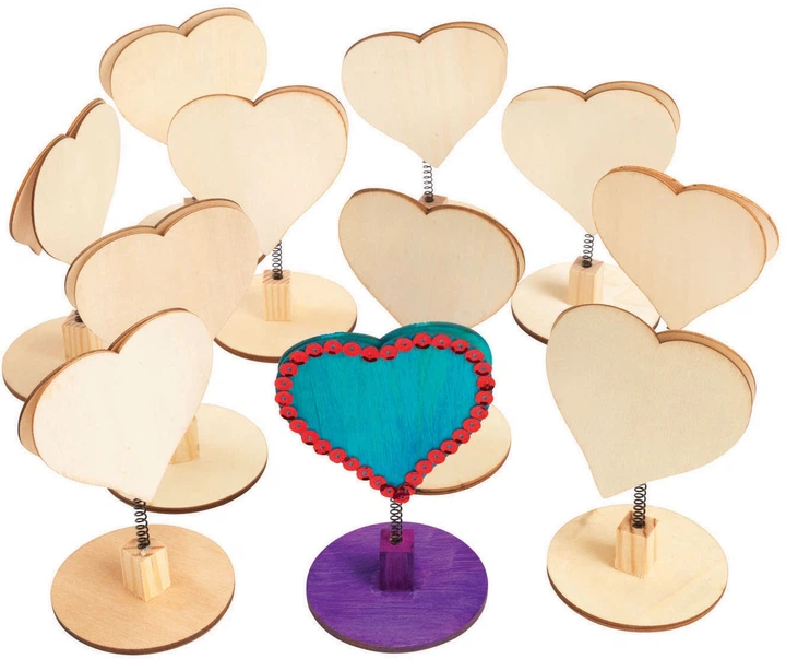 Набір містить 12 дерев'яних підставок для записок у формі серця. Кожна підставка має висоту 11,5 см і ширину 7,5 см. Ці підставки для записок підходять для різноманітних декорацій. Їх можна прикрасити олівцями, маркерами, фарбами, блискітками або клеєм, а також додати записку чи фотографію. Ідеальний подарунок на День святого Валентина, День матері, День батька або навіть День бабусі й дідуся.