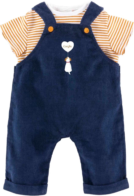 Цей комплект, що складається з темно-синього вельветового комбінезона та коричнево-білої футболки в смужку, ідеально підходить для маленьких ляльок Corolle розміром 30 см. Гарний принт із зображенням собаки, що тримає м'яч, доповнює цей комбінезон. Виготовлений з м'яких та міцних матеріалів, він легко одягається завдяки застібці на липучці, що ідеально підходить для маленьких ручок. Цей комплект підходить для дітей віком від 18 місяців.