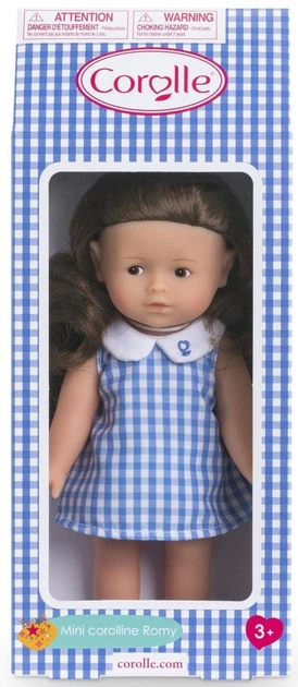 На ній гарна блакитна сукня в клітинку з комірцем у стилі Пітера Пена, трусики в тон та пара литих черевиків. Ідеально підходить для дітей віком від 3 років, ця маленька лялька легко поміщається в сумку, щоб супроводжувати вашу дитину протягом усього дня. Це ідеальний подарунок на день народження, сюрприз чи будь-яку іншу подію.