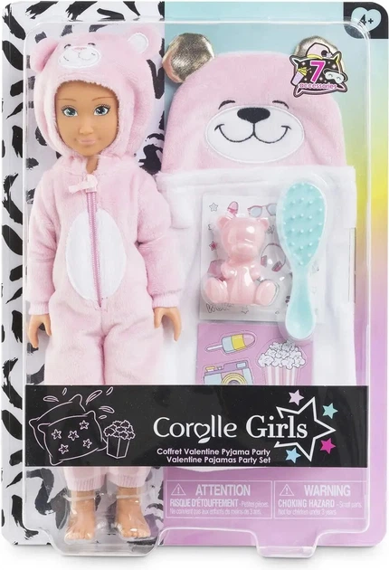 Набір для піжамної вечірки «Валентинка» включає ляльку Валентинку 28 см та 7 аксесуарів: 1 спальний мішок, 1 щітку для волосся, 1 плюшевого ведмедика, 1 аркуш із наліпками та 3 картонні ігрові аксесуари (1 фотоапарат, 1 морозиво та 1 пакет попкорну).