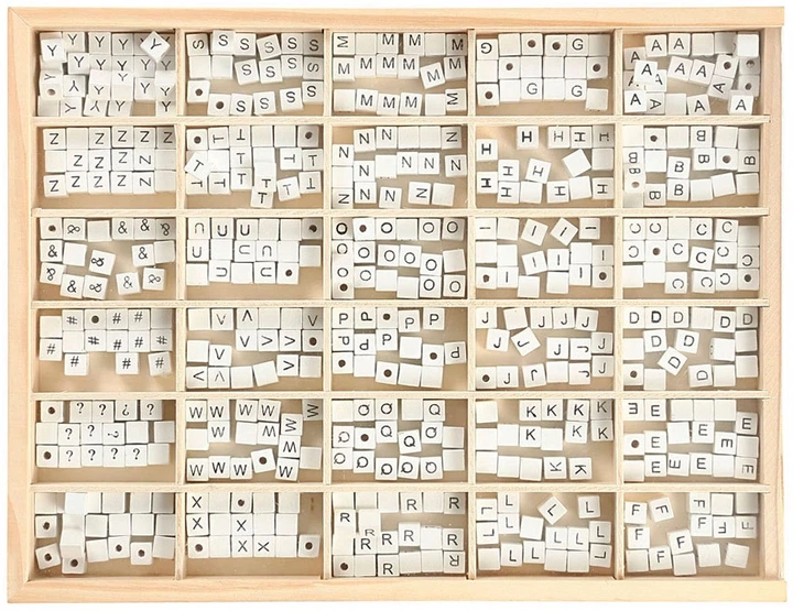 - Дизайн: кожна намистина позначена однією літерою алфавіту (AZ). Вони часто бувають у варіантах з чорним або кольоровим друком літери на натуральному дерев'яному фоні.
