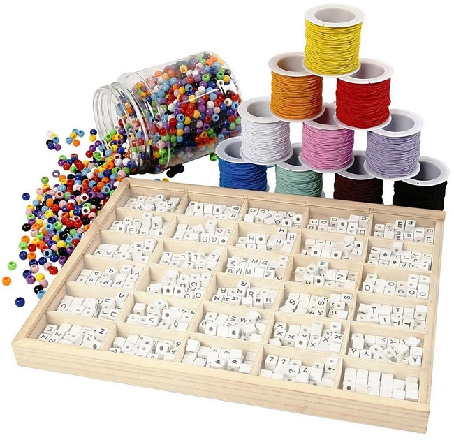 Цей набір для виготовлення браслетів розвиває як мовні, так і математичні навички. Слова та імена складаються з літерних намистин, а цифри — шляхом підбору браслета потрібного розміру та сортування намистин за порядком і кількістю.