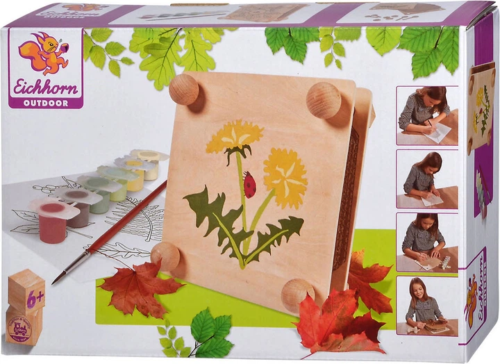 Набір для рукоділля «Прес для листя та квітів Eichhorn» пропонує творчі ігри на природі. Дерев'яний прес для квітів постачається з пензлем та шістьма кольорами фарб, що дозволяє дітям збирати та зберігати листя та квіти. Дайте волю їхній уяві, коли вони відображатимуть красу природи у витворах мистецтва. Це чудовий спосіб дізнатися про флору та створити незабутні спогади.