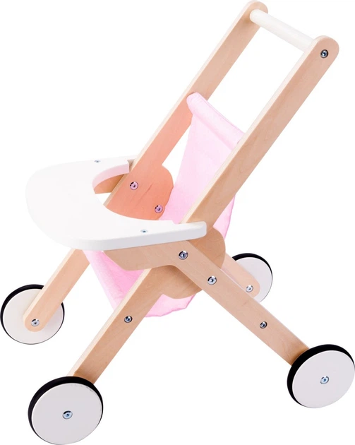 Міцна дерев'яна коляска для ляльок. Коляска має рожеве сидіння для ляльки, безшумні колеса та широкі підлокітники. Розміри: 45 x 33 x 50 см.