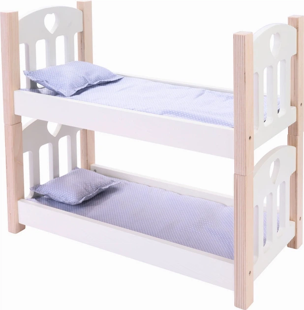 Це дерев'яне двоярусне ліжко для ляльок кріпиться за допомогою магнітів, що дозволяє використовувати його як двоярусне, так і односпальне ліжко. Двоярусне ліжко постачається з матрацами, ковдрами та подушками сірого та білого кольорів і підходить для всіх ляльок!