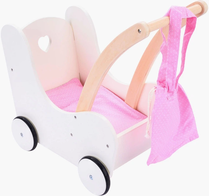 Ці дерев'яні ходунки для ляльок мають білу колиску, рожеву постільну білизну та рожеву сумку для перенесення. Вони мають тихі колеса та виготовлені з високоякісної деревини.