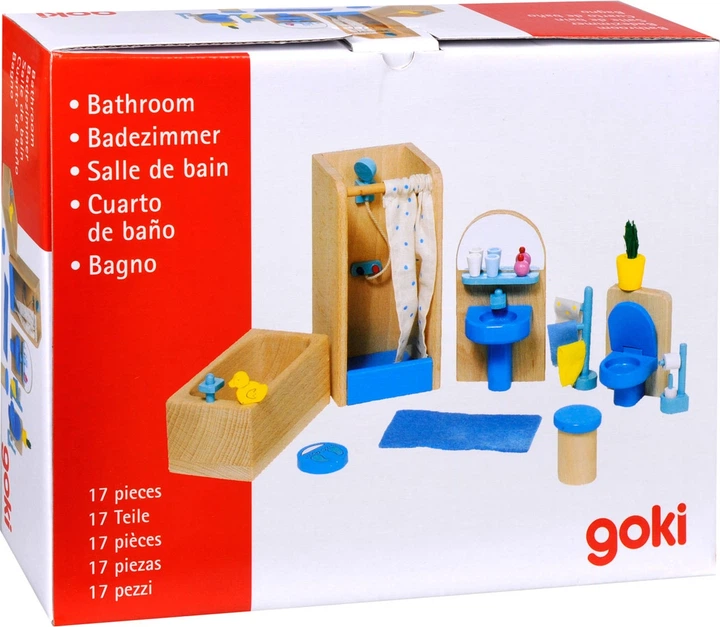 Lalki w Twoim domku dla lalek również lubią regularnie brać kąpiel lub myć ręce po zabawie. Dzięki temu zestawowi łazienkowemu mają zapewniony pełen komfort. Twoje lalki mogą korzystać z wanny z gumową kaczuszką, prysznica z zasłoną, umywalki z lustrem i akcesoriami, wieszaka na ręczniki, toalety z doniczką jako dekoracją, papieru toaletowego (z uchwytem), maty łazienkowej, wagi, a nawet stołka do odpoczynku! Zawartość: 17 drewnianych mebli i akcesoriów.