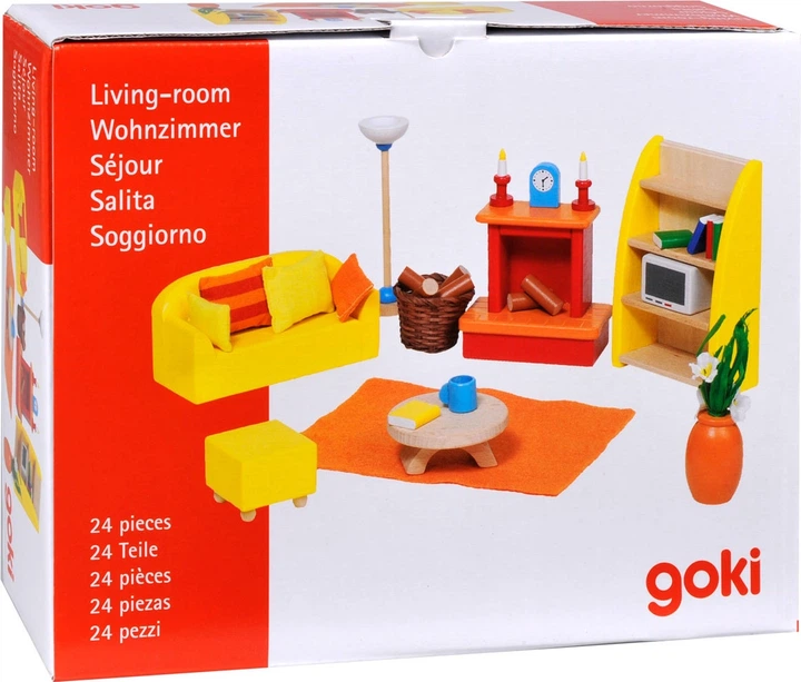 Spraw, aby salon w Twoim domku dla lalek stał się przytulny dzięki temu zestawowi mebli. Ustaw sofę przy kominku, włącz lampę i usiądź na kanapie z lalką, aby poczytać książkę. Drewniany zestaw zawiera łącznie 24 drewniane elementy mebli i akcesoriów, takie jak stolik kawowy, dywanik i regał na książki.