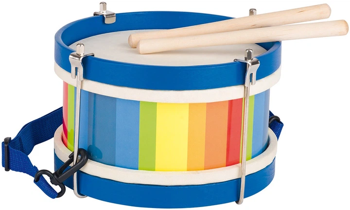 Барвистий дерев'яний барабан з ремінцем для перенесення. У комплекті 2 барабанні палички.