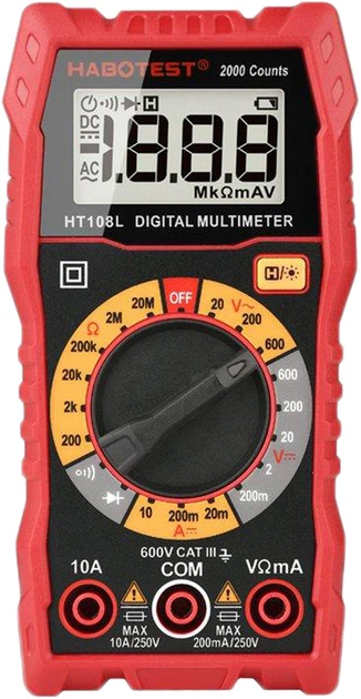 Мультиметр HABOTEST DC600В/10A, AC600В дозволяє вимірювати: постійний струм, постійну напругу, змінну напругу, опір, перевіряти діоди та безперервність ланцюга. З підсвічуванням дисплея, попередження про низький заряд батареї. Підставка на задній стороні корпусу дозволяє розташувати прилад для кращої видимості показань. Автоматичне вимкнення для заощадження батареї. Дисплей на 2000 відліків. Компактний, маленький та легкий. Ергономічна форма, зручно тримати у руці. У комплекті із тестовими проводами. Батареї не включені.