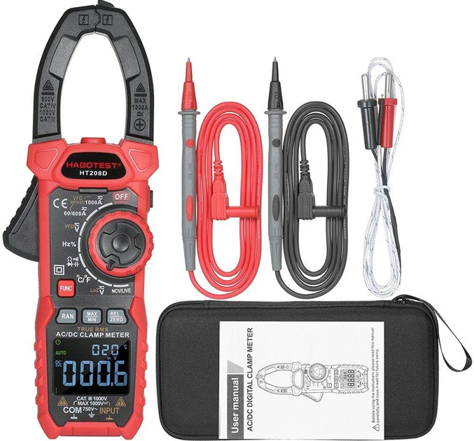 Затискний вимірювач HABOTEST DC1000В/1000A, AC750В/1000A дозволяє вимірювати: постійний струм, змінний струм, постійну напругу, змінну напругу, опір, місткість конденсатора до 100мФ, частоту до 10МГц, виконує перевірку цілісності діодів та ланцюгів. Затискний вимірювач призначений для безконтактного вимірювання струму. З підсвічуванням екрана, функцією вимірювання температури, попередженням про низький заряд батареї. Він має спеціальні скоби для кріплення кабелів та скобу для підвішування мультиметра на стіну. Автоматичне вимкнення живлення заощаджує заряд батареї. Дисплей із 6000-розрядною шкалою. Компактний, ергономічної форми, зручно тримати у руці, корпус стійкий до механічних пошкоджень. У комплекті з вимірювальними проводами та зручним футляром. Батареї не включені.