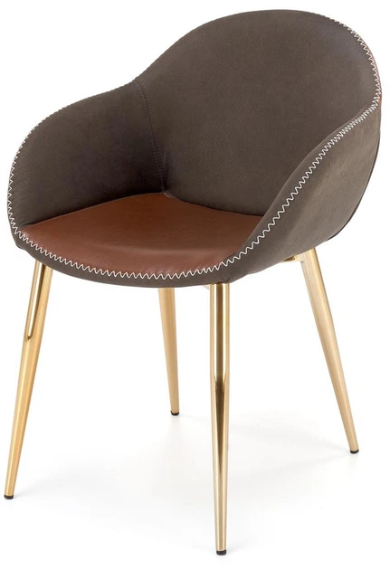 Надихніться унікальним стилем крісла K304, яке поєднує сучасність та елегантність. Це крісло, виготовлене з темно-сірої штучної шкіри та коричневого сидіння, привертає увагу своєю характерною білою строчкою. Його золотисті хромовані ніжки надають йому розкішного вигляду, роблячи його не просто предметом меблів, а справжнім центром будь-якого інтер'єру.