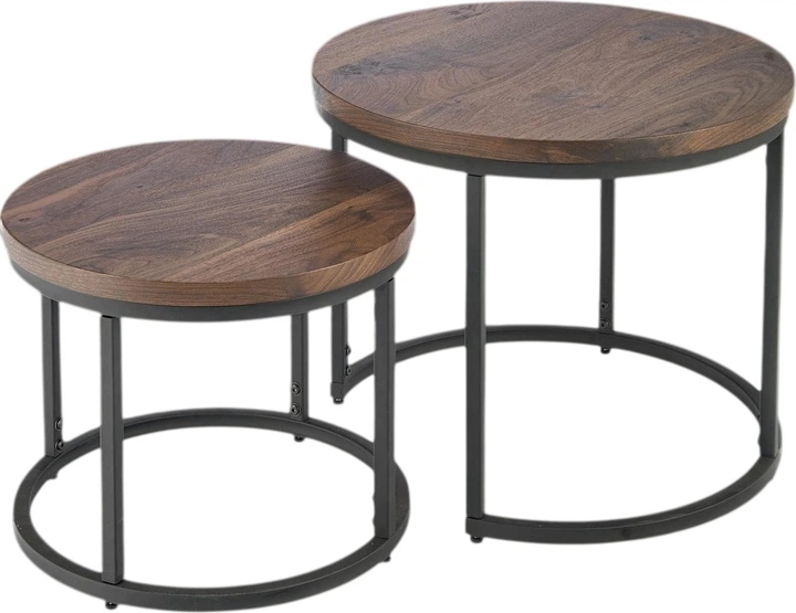 Цей комплект із двох сучасних журнальних столиків поєднує теплий відтінок горіха з елегантним чорним покриттям. Ідеально підходить для вітальні, кабінету або простору в стилі лофт. Функціональний, стильний та ідеально підходить для багатошарового використання.