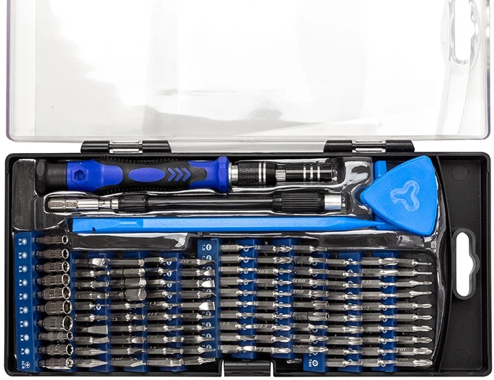 Набір магнітних викруток, 124 предмети — професійний інструмент для точного ремонту електроніки. Ідеально підходить для обслуговування ноутбуків, смартфонів, планшетів, ігрових консолей, фотоапаратів та іншої техніки. Завдяки широкому набору змінних біт і зручній ручці, забезпечує комфортну роботу навіть у важкодоступних місцях.