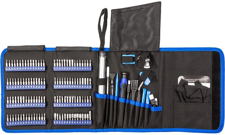 Набір магнітних прецизійних викруток з електричною викруткою, 144 предмети — універсальний професійний комплект для ремонту електроніки. Підходить для обслуговування телефонів, ноутбуків, планшетів, фотоапаратів, ігрових консолей, годинників та інших пристроїв. Усі інструменти зручно розміщені в портативному міцному тканинному футлярі.