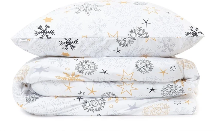 Комплект включає підковдру розміром 160 x 200 см та дві наволочки розміром 70 x 80 см. Різноманітні сніжинки у відтінках жовтого, чорного та сірого кольорів розміщені на білому тканинному фоні, надаючи постільній білизні ніжного, зимового відчуття.
