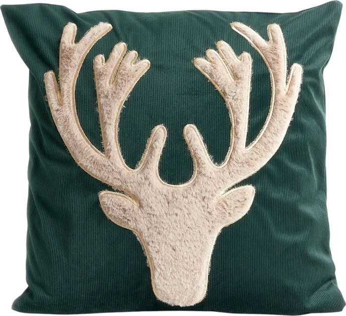 Наволочка Homla Vintec має плюшевий візерунок у формі голови оленя з декоративними рогами. Якщо покласти її на подушку, вона надає їй нового вигляду та стає яскравим елементом вашого святкового декору. Зелено-коричнева кольорова гама ідеально доповнює різдвяні прикраси та ковдри.