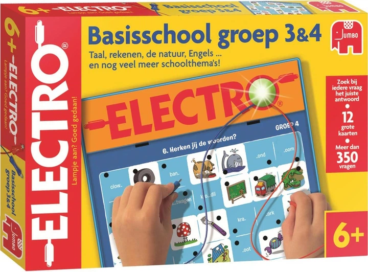 З’єднайте кожне запитання з правильною відповіддю за допомогою червоного та синього проводів. Якщо відповідь правильна, світло ввімкнеться. «Electro School Groups 3 and 4» містить 12 великих карток з понад 350 вправами на трьох різних рівнях: