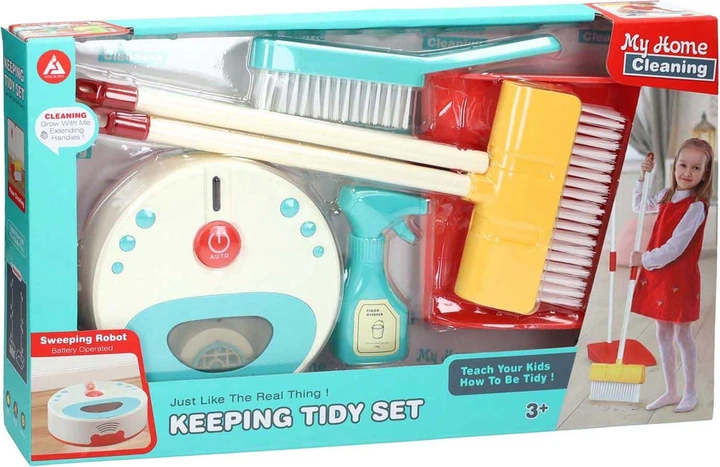 Іграшковий набір для прибирання з роботом-пилососом, мітлою та аксесуарами.