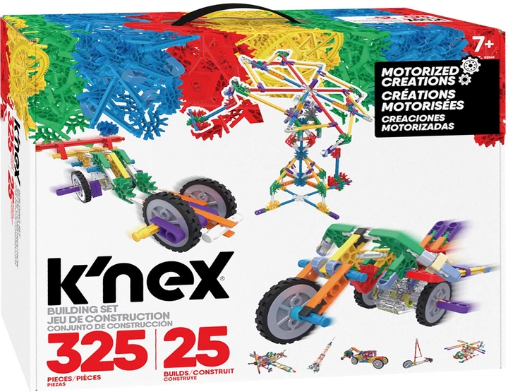 Створюйте найкрутіші дизайни та моделі з моторизованим набором K'NEX! Зберіть одну з 25 моделей з 325 деталей. Це заохочує творчість, спостережливість та розвиток технічних і моторних навичок.