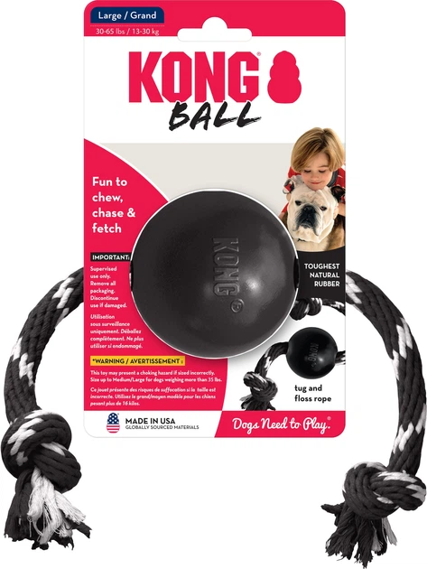 М'яч Kong Extreme Ball with Rope – це міцний м'яч на мотузці для собак, рекомендований для дорослих собак із сильними щелепами та високою жувальною здатністю. Виготовлений з найміцнішої чорної гуми, він підходить для собак, схильних до руйнування іграшок. Він стійкий до проколів.