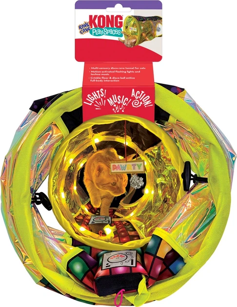 Kong Play Spaces Rave Cave sprawi, że sobotnie wieczory Twojego kota będą gorące – tak samo jak każda inna pora dnia i nocy! Trzeszcząca podłoga zachęca kota do tańca breakdance całym ciałem, a aktywowane ruchem techno rytmy z lat 90. i migające światła retro pobudzają zmysły Twojego pupila. Lśniąca kula dyskotekowa zwisa z sufitu, zachęcając do zabawy i tańca.