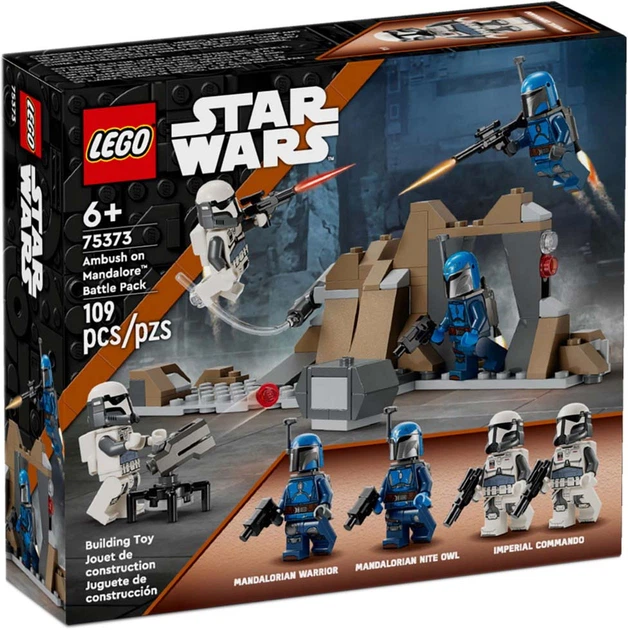 Діти можуть грати в епічні битви на реактивних ранцях із конструктором LEGO Star Wars: The Mandalorian Ambush у бойовому наборі Mandalore (75373). Це ідеальна ідея подарунка для творчих хлопчиків, дівчаток і шанувальників від шести років. З цим будівельним набором вони зможуть заново пережити дію Star Wars: The Mandalorian Season 3 з 4 колекційними мініфігурками LEGO: мандалорською Нічною совою, мандалорським воїном і 2 імперськими командирами. У набір також входить безліч аксесуарів LEGO, включаючи бластери, бластерні пістолети та реактивні ранці, а також прозорий елемент із ручкою, який дозволяє мініфігурці LEGO «літати». Також є скеля з печерою, яку можна будувати, і стрілецька рушниця, щоб розширити ігрові можливості.