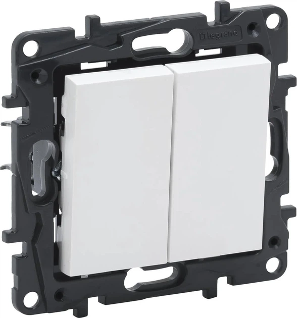 Перемикач двоклавішний Legrand Niloe Step 10 A 863108 білого кольору – це елемент серії класичної квадратної форми, розроблений з урахуванням створення цілісного та естетичного інтер'єру. Матова поверхня в відтінку, близькому до RAL 9003, добре поєднується як зі світлими стінами, так і з більш контрастними оздобленнями.
