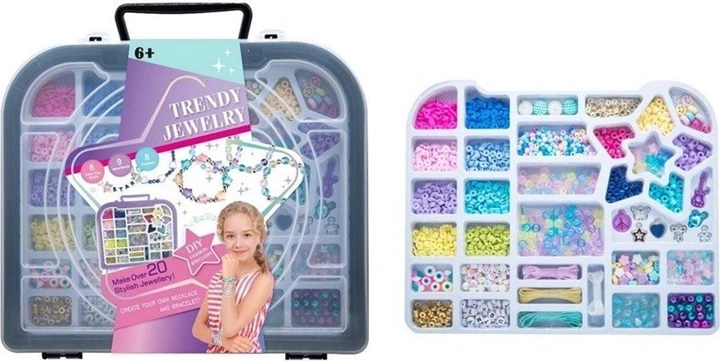 Футляр вміщує десятки дрібних предметів у відділеннях, еластичні нитки для нанизування та декоративні намистини різних форм. Підходить для дітей віком від 6 років, він виготовлений з легких, безпечних матеріалів, які легко впорядковувати після гри.