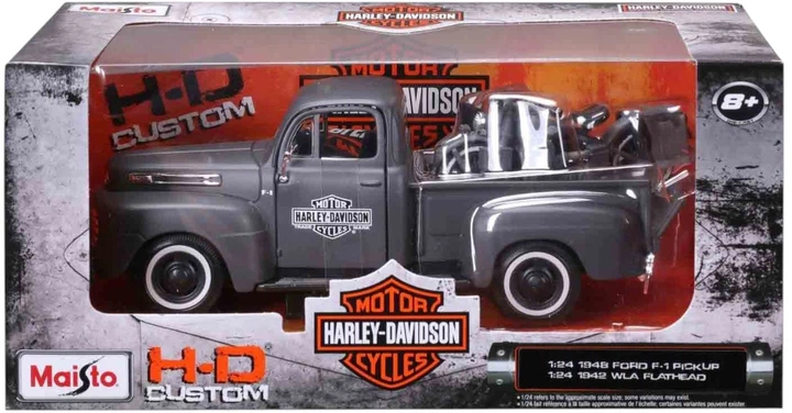 - Zestaw zawiera pickupa oraz motocykl Harley-Davidson