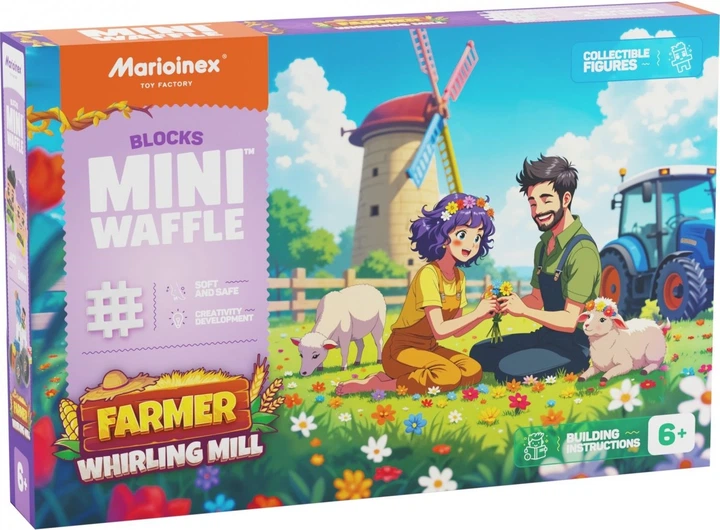 Набір «Фермер: Шалений млин» переносить дітей у світ, де технології та природа працюють у ідеальній гармонії. Зі 109 гнучких, барвистих вафельних блоків ви можете побудувати функціональний млин з обертовими лопатями, затишний котедж, трактор та фермерське середовище, що кишить життям! Набір включає дві фігурки фермера – працьовитого Джека, який добре знає сільськогосподарську техніку, та Емму, спокійну доглядальницю млина та сільськогосподарських тварин. Кожна деталь набору розроблена, щоб розпалити уяву та заохотити до створення історій про фермерське життя. Чи встигне Емма підготувати млин до вечора? Чи полагодить Джек плуг до початку дощу? У світі міні-вафель все залежить від маленьких ручок та великої фантазії!