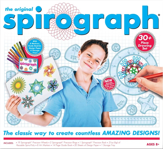 Набір для гри «Спірограф» з маркерами – це класичний творчий набір, який дозволяє малювати складні геометричні візерунки (циклоїдальні, епіциклоїдальні та гіпоциклоїдні криві) за допомогою шестерень та спеціальних шаблонів. Цей набір постачається з додатковими маркерами, які дозволяють одразу створювати барвисті дизайни.