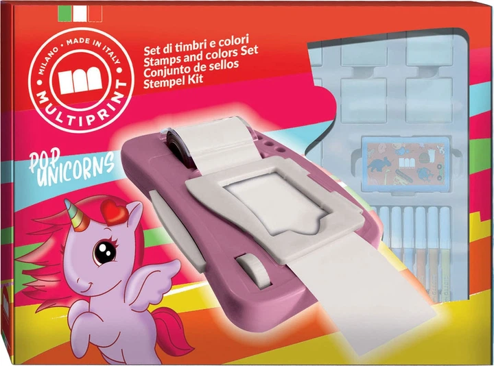 Дайте волю своїй уяві з цими супермилими наліпками-єдинорогами! За допомогою цього веселого штампу та диспенсера для малювання ви можете створювати власні "наліпки" із наймилішими єдинорогами. Нанесіть дерев'яний штамп на пластикову рамку та розфарбуйте її маркерами, що додаються. Тепер поверніть рулон паперу, щоб вийняти зображення з рамки, та виріжте його ножицями, що додаються та зручно зберігаються в шухляді під диспенсером. Виріжте барвистий штамп та приклейте зображення куди завгодно!